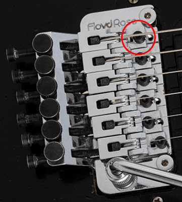 ▼フロイドローズ(Floyd Rose)タイプのサドルは、前にある六角レンチで固定されているので、弦を緩めて、固定を解除して前後に動かします。